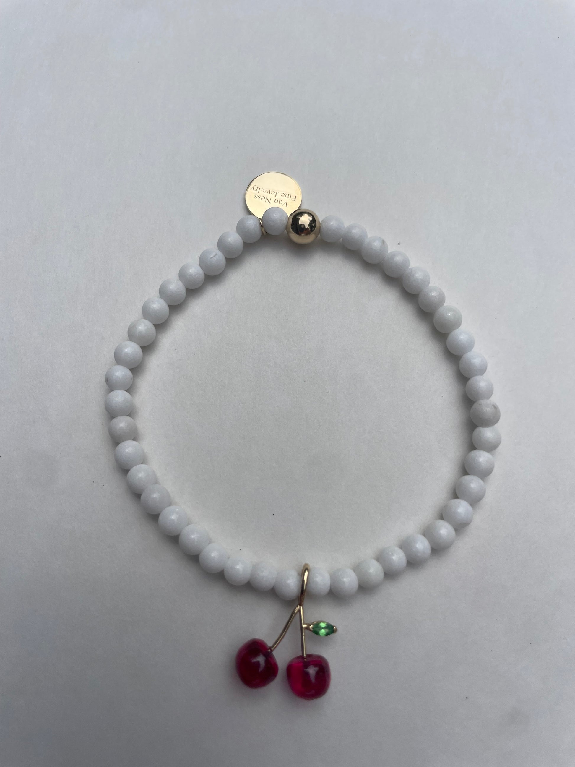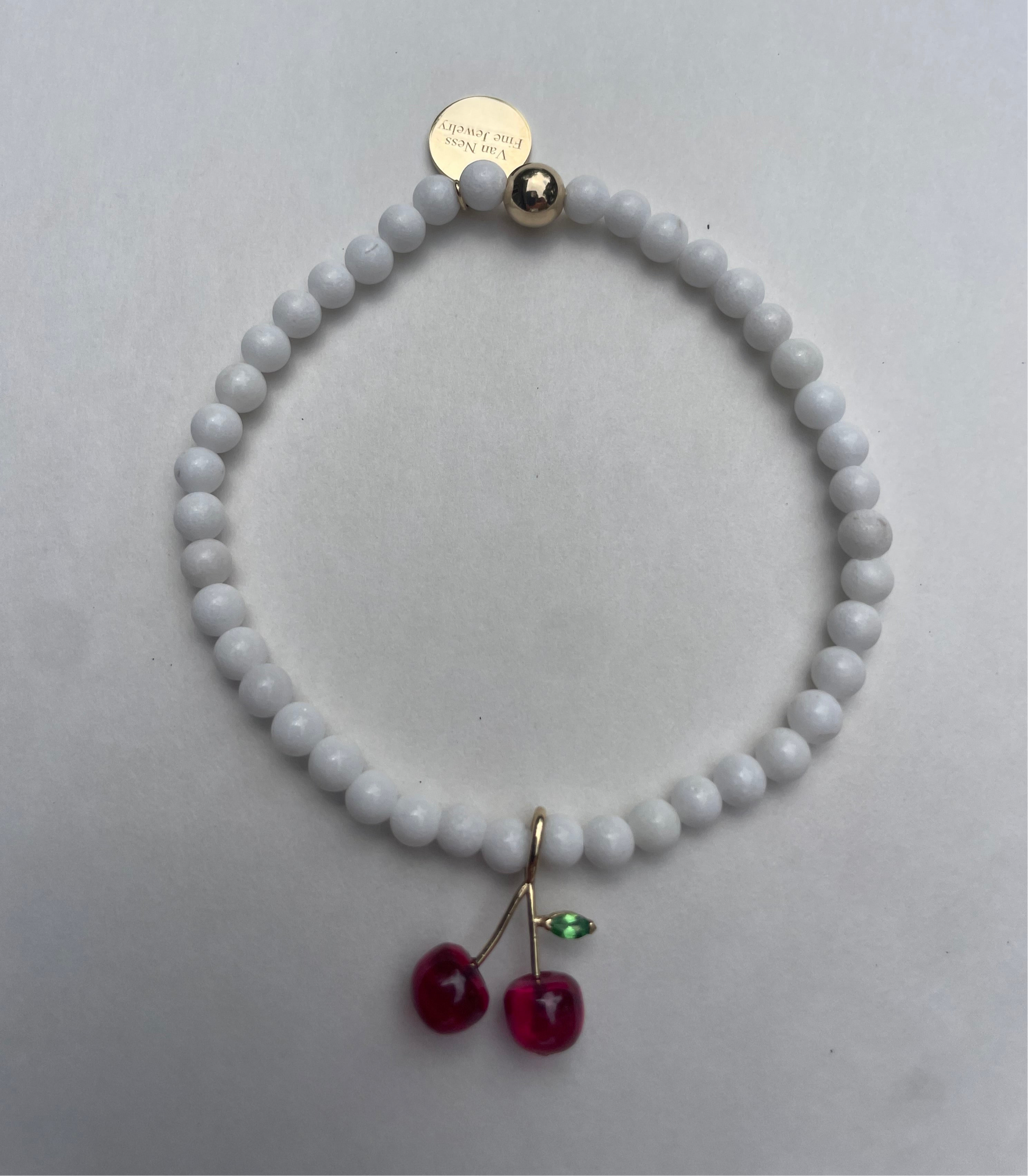 White jade beaded bracelet. 4-5mm. 14K yellow gold findings and signature tag. Cherry charm 14K YG, lab-grown ruby cherries, natural green tsavorite leaf. Charm is approx 1/2 inch by 1/2 inch.